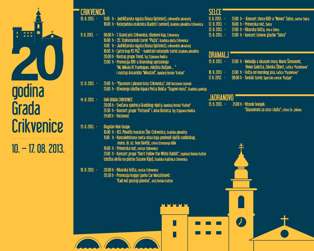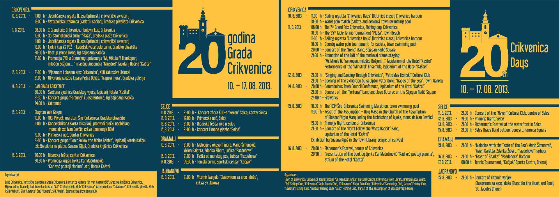 Ovogodišnji Dani Grada Crikvenice odvijat će se od 10. do 17. kolovoza 2013. godine. U jubilarnoj godini, kada Crikvenica slavi 20 godina svog postojanja kao jedinica lokalne samouprave, pripremili smo za vas bogati program prepun atraktivnih sportskih, kulturnih i zabavnih događanja.