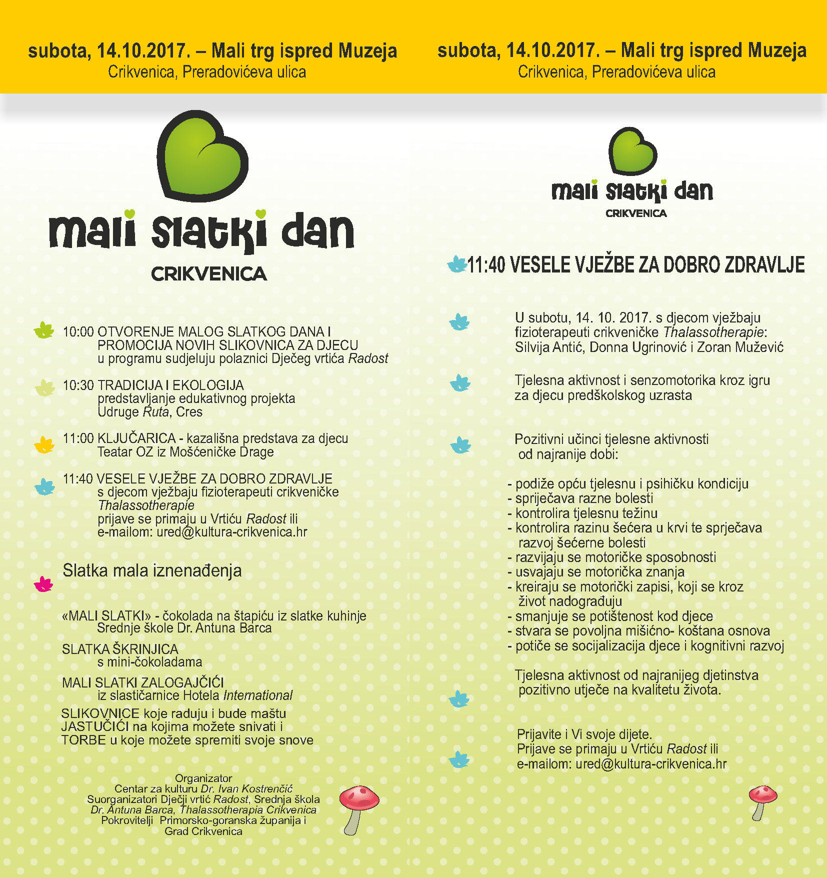 Za više informacija i program događanja preuzmite privitak.U subotu 14.10.2017. održati će se Mali slatki dan u Crikvenici na malom trgu ispred Muzeja.