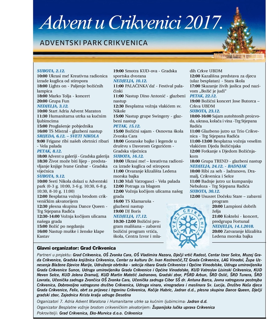 Očekuje vas prava adventska čarolija, Adventski park prepun događanja, radionice, koncerti, predstave i mnoštvo iznenađenja, božićni sajam, skazanje živih jaslica te zabava za sve uzraste.Advent u Crikvenici 2.12.2017. - 14.1.2018.