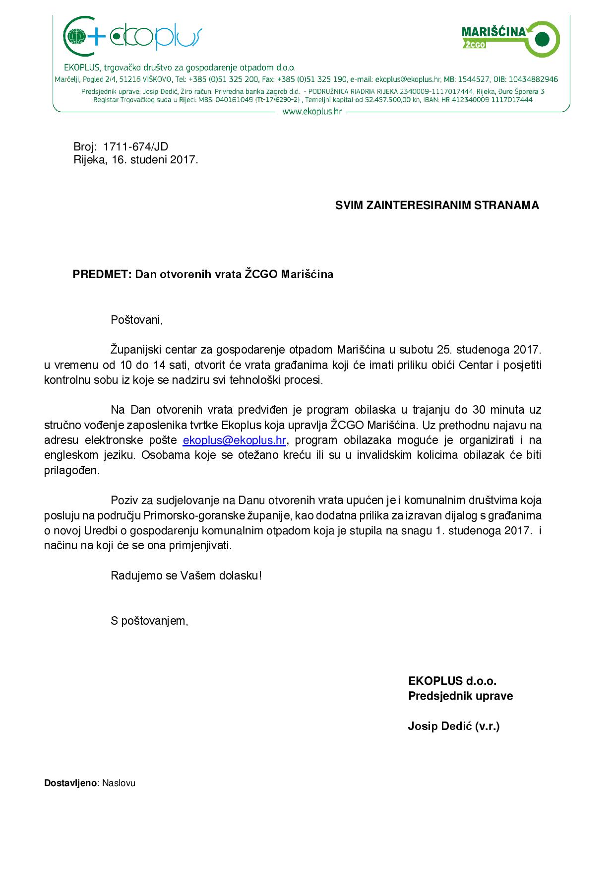 Poštovani građani, tvrtka Ekoplus d.o.o. koja upravlja Županijskim centrom za gospodarenje otpadom (ŽCGO) Marišćina drugu subotu, 25.11.2017., organizira Dan otvorenih vrata za građane.