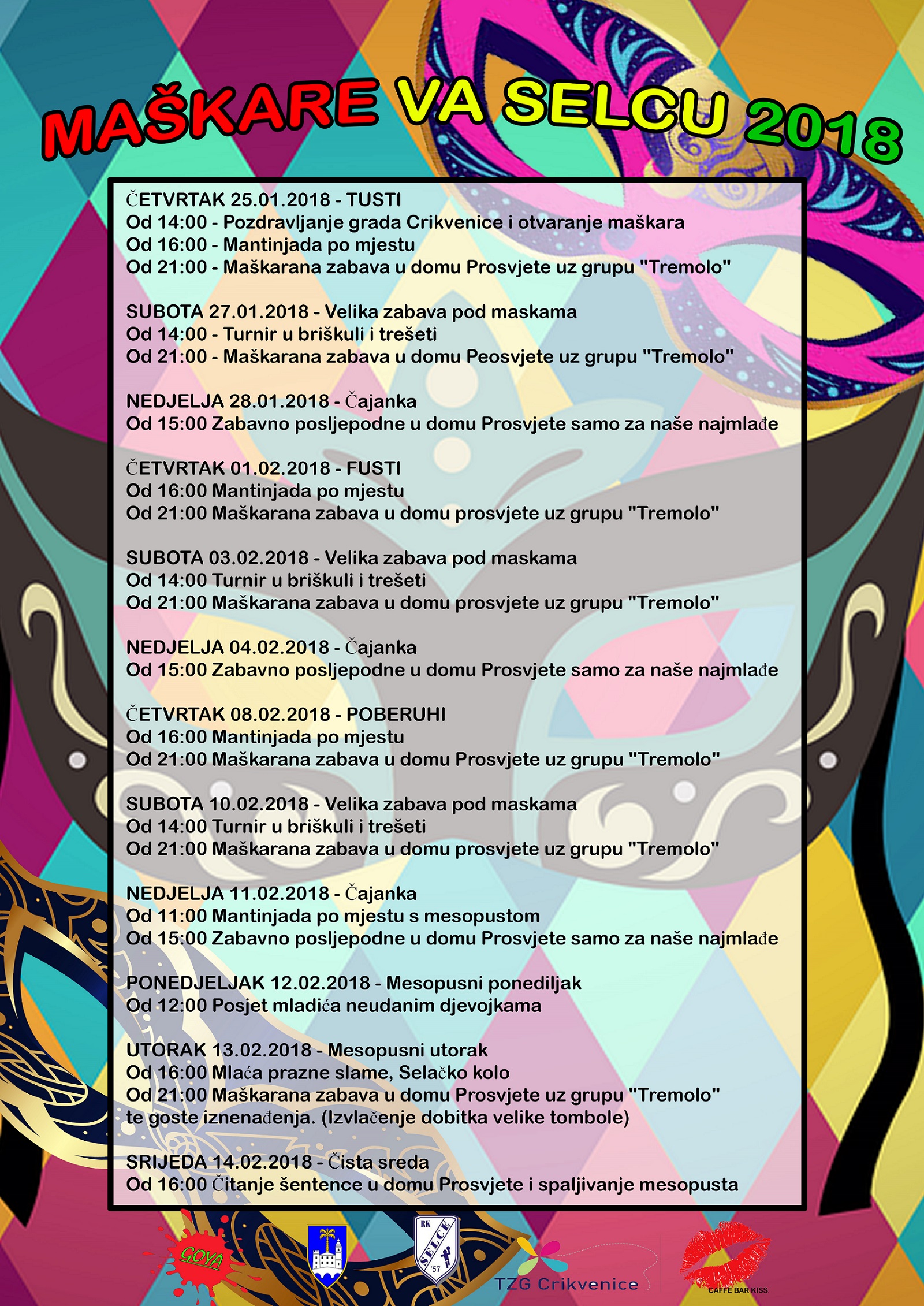 P.s. Još uvijek se stignete prijaviti za sudjelovanje u tradicionalnoj Dječjoj ili Velikoj maškaranoj povorci u Crikvenici, koje će se održati u nedjelju, 4. veljače 2018. Rok za prijavu je 26. siječnja, a detaljnije informacije možete dobiti na Ova e-mail adresa je zaštićena od spambota. Potrebno je omogućiti JavaScript da je vidite. ili 091 241 0514 (kontakt osoba: Tea Car Reljac).