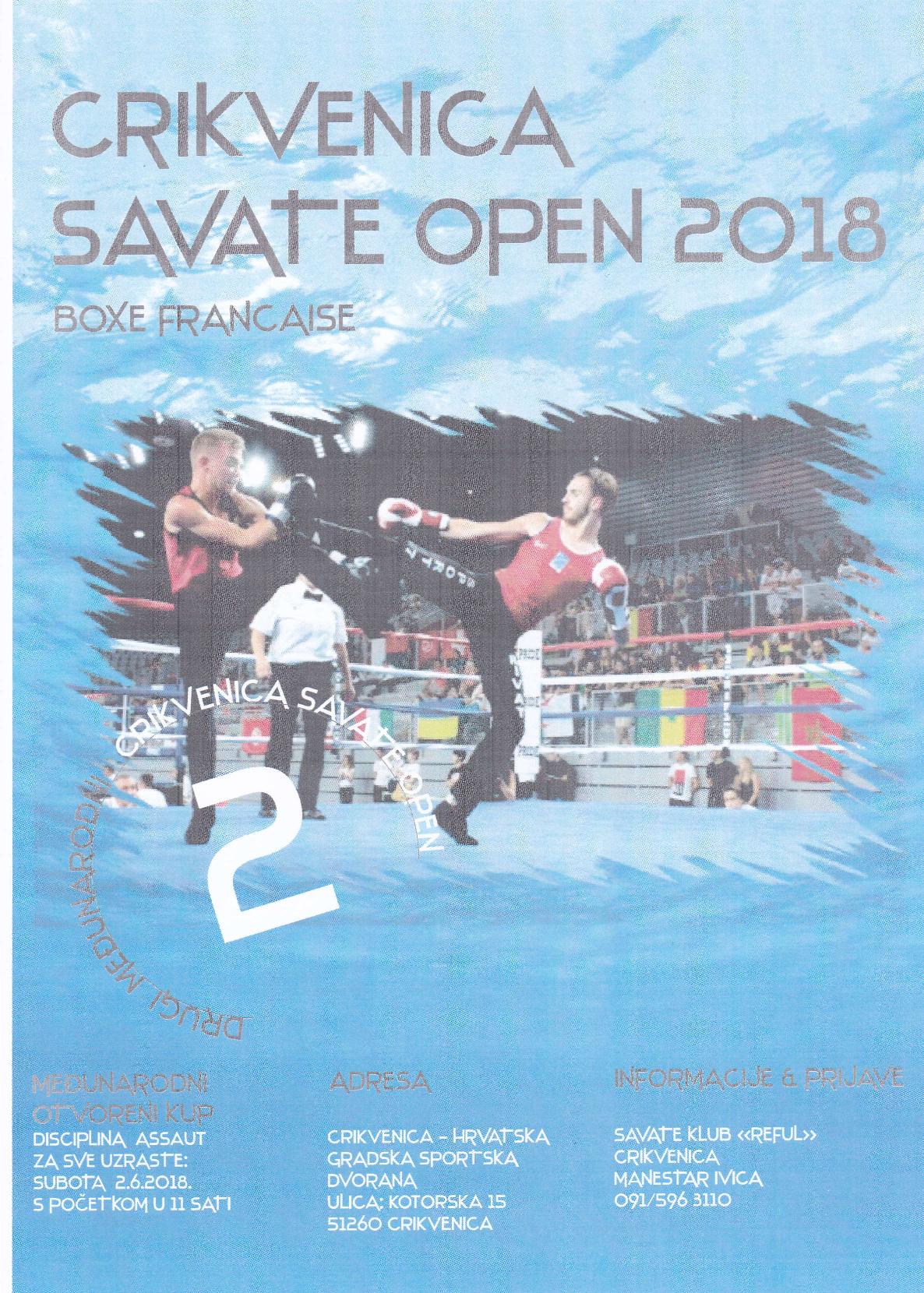 Riječ je o međunarodnom otvorenom savate turniru u disciplini assaut za sve uzraste, a održavat će se u crikveničkoj Gradskoj sportskoj dvorani, i to s početkom u 11 sati. Očekuju se natjecatelji iz gotovo svih hrvatskih savate klubova te dolazak natjecatelja iz nekoliko europskih zemalja. Natjecanje se organizira za sve kategorije sportaša u muškoj i ženskoj kategoriji. Organizacija ovog zanimljivog sportskog susreta omogućit će promidžbu savate boksa (francuskog boksa) te zdravog i aktivnog načina života, ali i turističku promidžbu crikveničke rivijere koja će sportašima zasigurno ostati u lijepom sjećanju.
