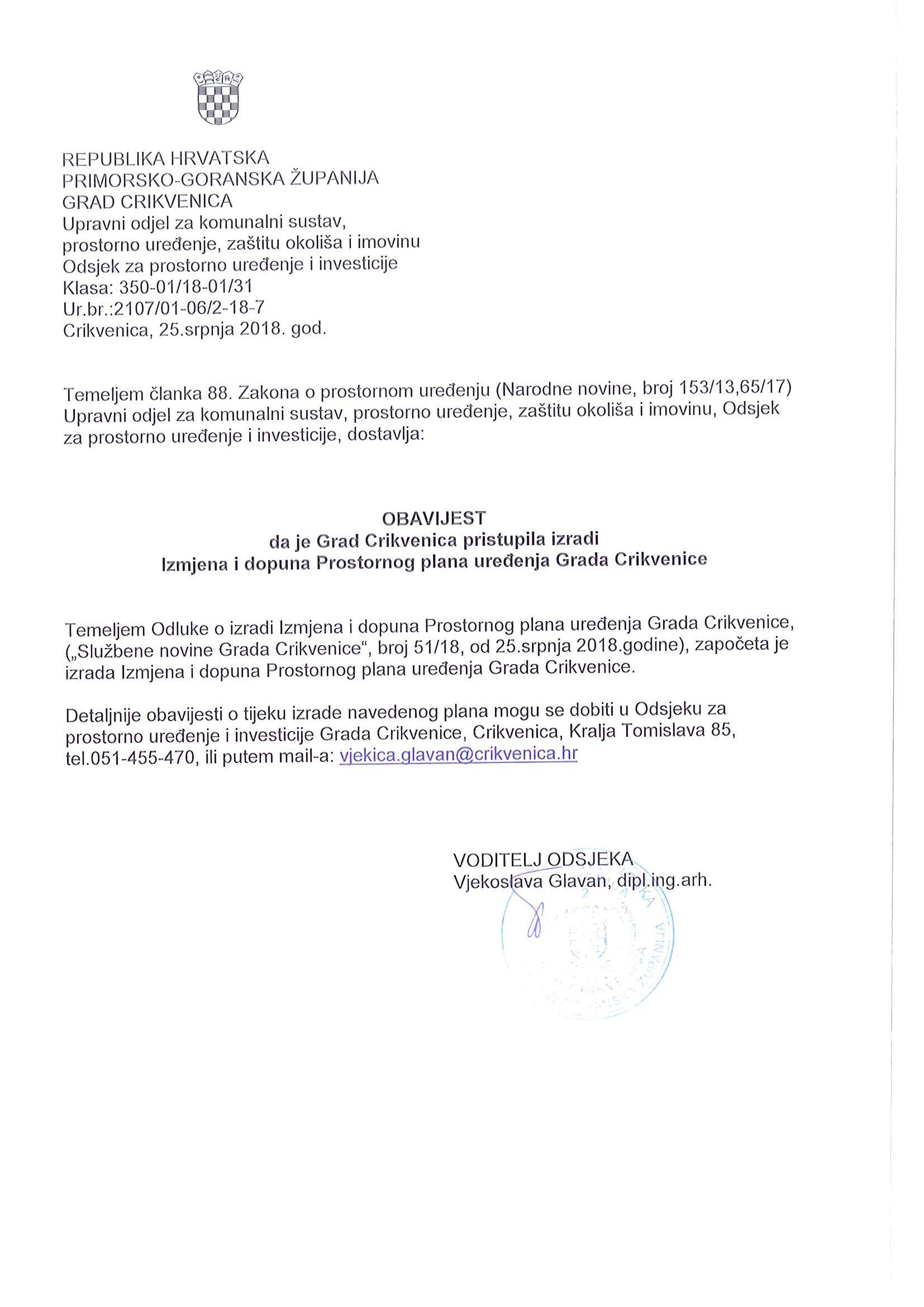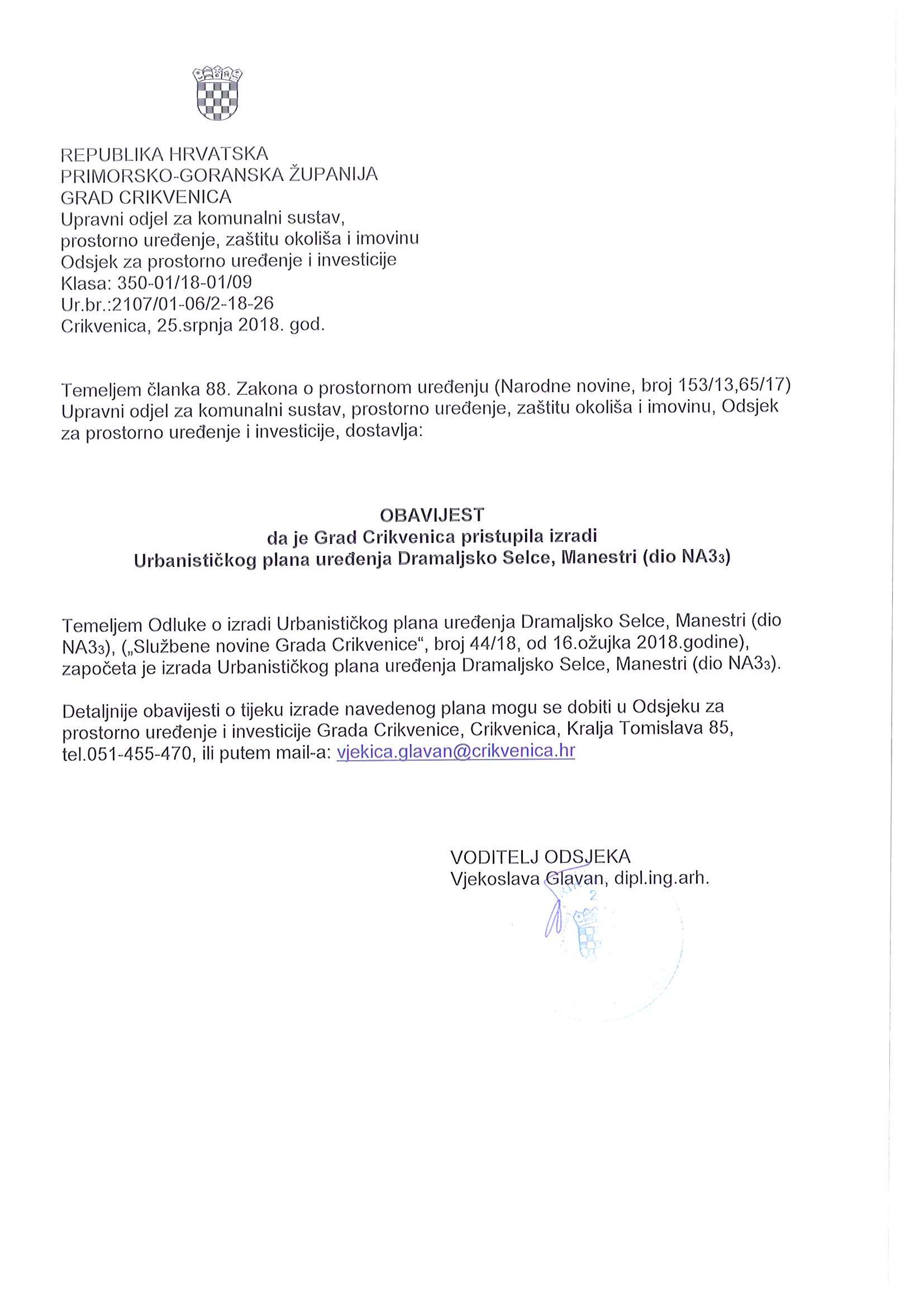 Obavijest o donošenju dvije Odluke: o izradi Izmjena i dopuna prostornog plana uređenja Grada Crikvenice i o izradi UPU-a Dramaljsko Selce, Manestri.