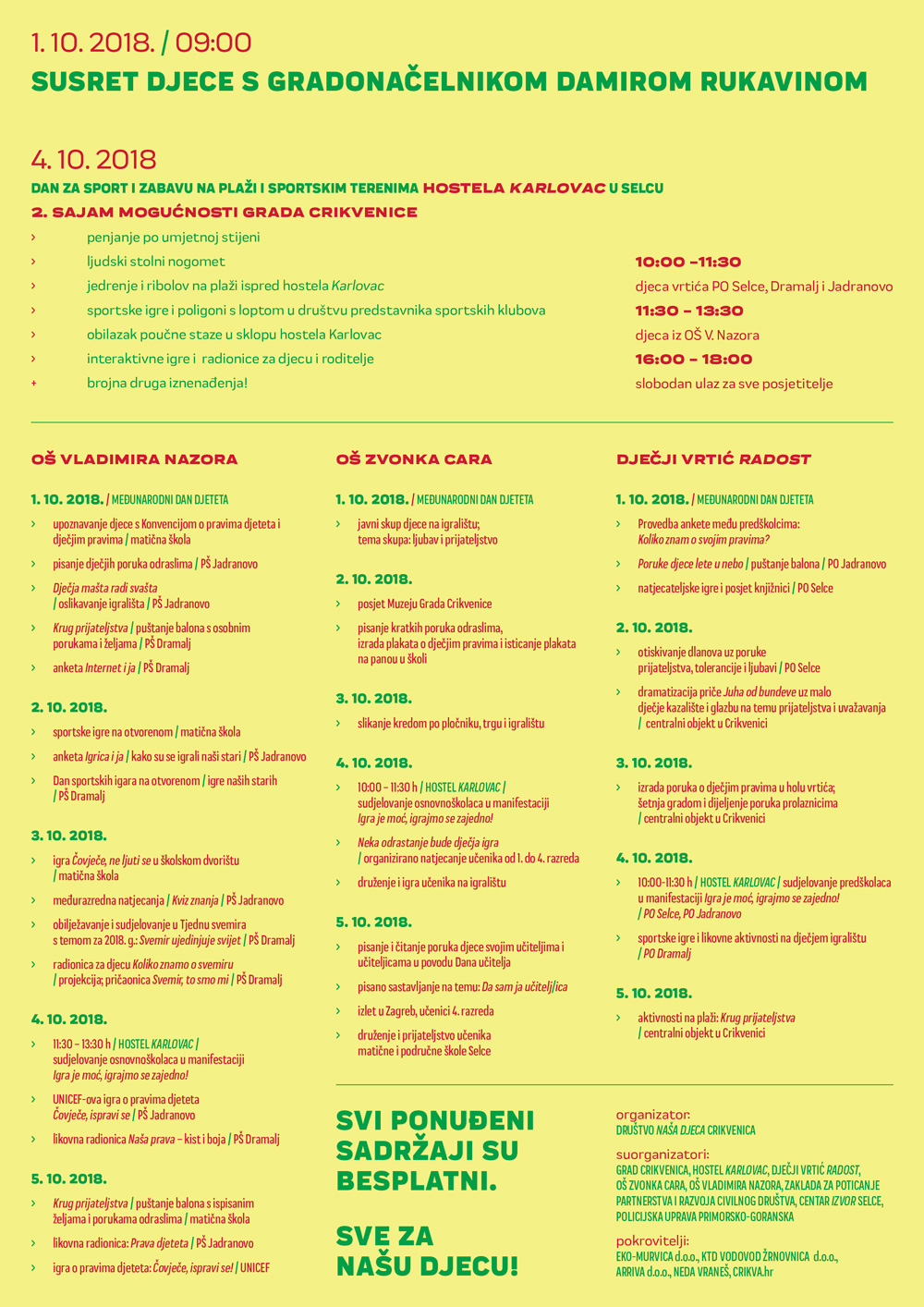 Svi su programi besplatni, a u ponedjeljak će djeca dviju osnovnih škola i vrtića posjetiti gradonačelnika Grada Crikvenice Damira Rukavinu. Gradonačelnik će djecu primiti u Sali za sastanke Gradske uprave Grada Crikvenice u 09:00 sati ujutro te će porazgovarati s djecom i čuti kako oni razmišljanju i kakve ideje imaju.