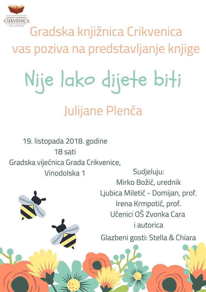 Raduje me pozvati vas na promociju moje treće zbirke poezije, a prve zbirke dječje poezije Nije lako dijete biti., u Gradskoj vijećnici, Crikvenica 19.10.2018. u 18 sati. Julijana