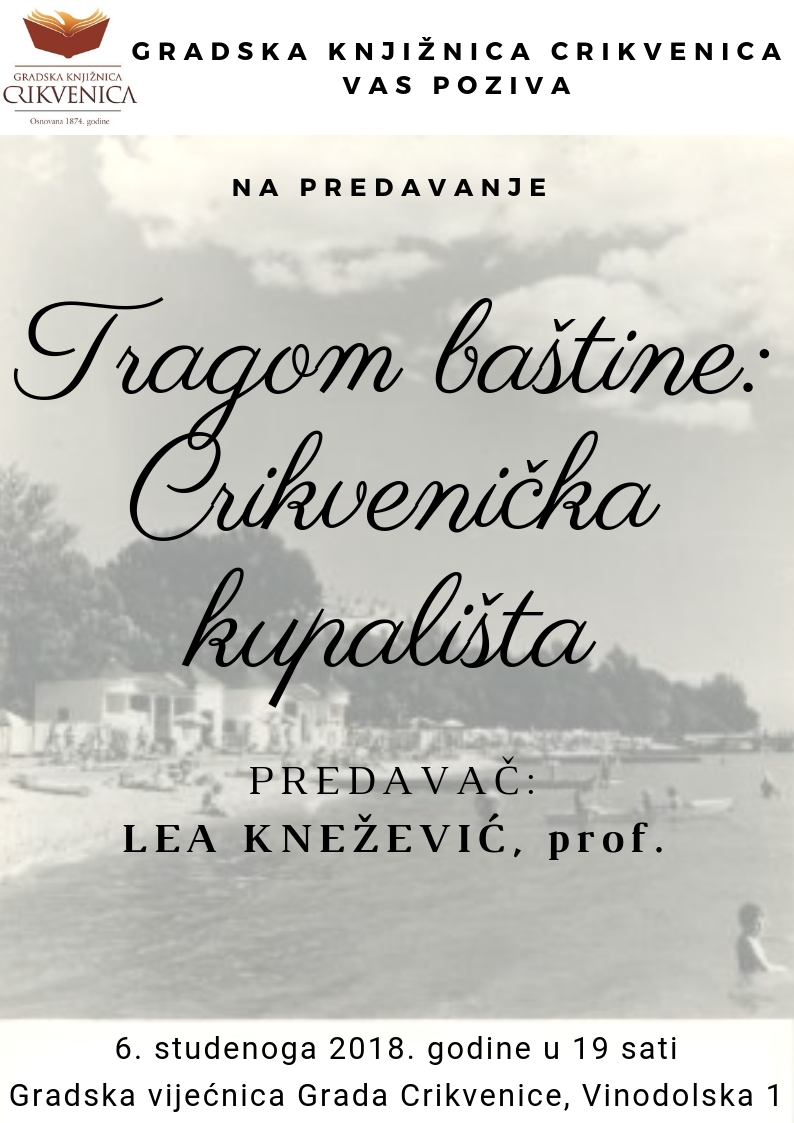 Gradska knjižnica Crikvenica poziva u utorak, 6.11.2018 u 19 sati u Gradsku vijećnicu Grada Crikvenice, Vinodolska 1 na predavanje o iznimno važnom dijelu crikveničke baštine pod nazivom Tragom Baštine - Crikvenička kupališta. Predavač je profesorica Lea Knežević, ulaz je besplatan.