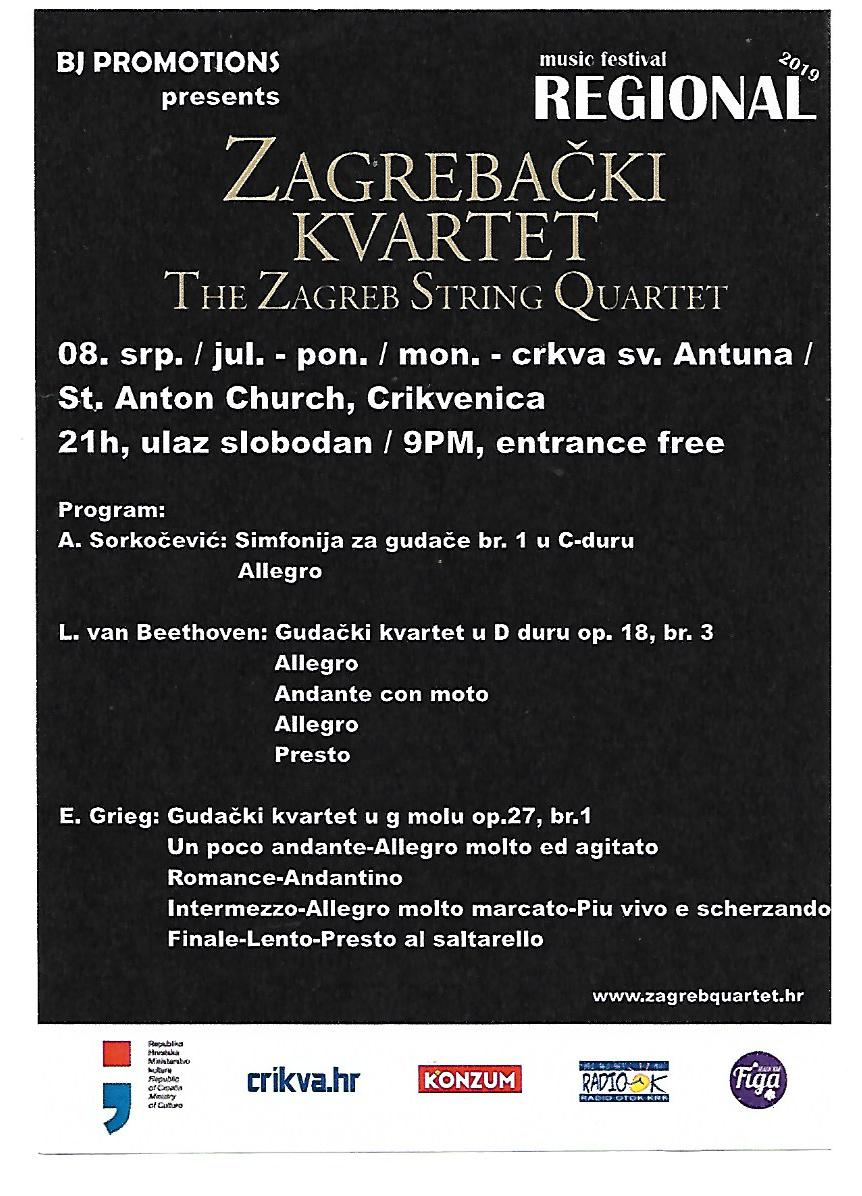 „U sklopu festivala "Regional 2019" večeras u crkvi sv. Antuna u Crikvenici uz potporu Ministarstva kulture nastupa proslavljeni Zagrebački kvartet sa programom djela A. Sorkočevića, L. van Beethovena i E. Griega.