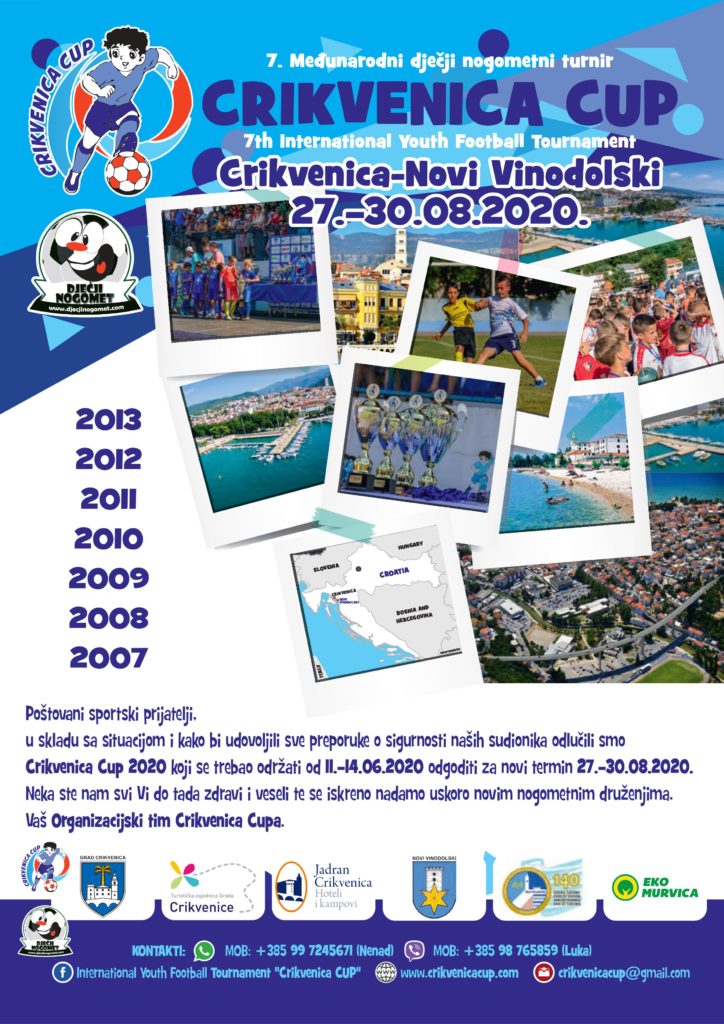 Iako sport trenutno mnogima nije primarno u fokusu, obzirom na globalne probleme uzrokovane epidemijom COVID-19, poznato je da su sportaši jako uporni, pa je organizator ovoga turnira – Udruga sportske rekreacije „Crikvenica Cup“ u skladu sa preporukama za održavanje sportskih natjecanja na otvorenom odlučio odgođeni termin iz lipnja prebaciti u kolovoz te će uskoro Crikvenica biti domaćin sedmog po redu Međunarodnog dječjeg nogometnog turnira „Crikvenica Cup“, koji će se održati od 27. do 30. kolovoza 2020. na crikveničkom gradskom stadionu.