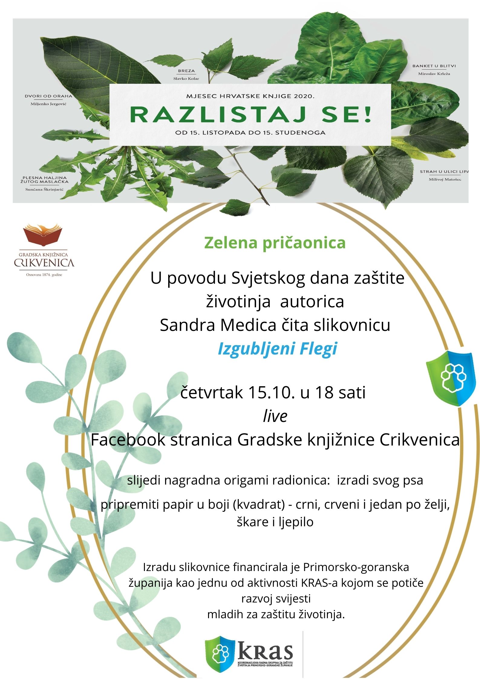 U Gradsku knjižnicu Crikvenica 15. 10. u goste dolazi odgojiteljica Sandra Medica, autorica slikovnice Izgubljeni Flegi, a live prijenos i nagradnu origami radionicu možete pratiti u 18 sati na našoj Facebook stranici. Za radionicu je potrebno pripremiti papir u boji (kvadrat) - crni, crveni i jedan po želji, škare i ljepilo.